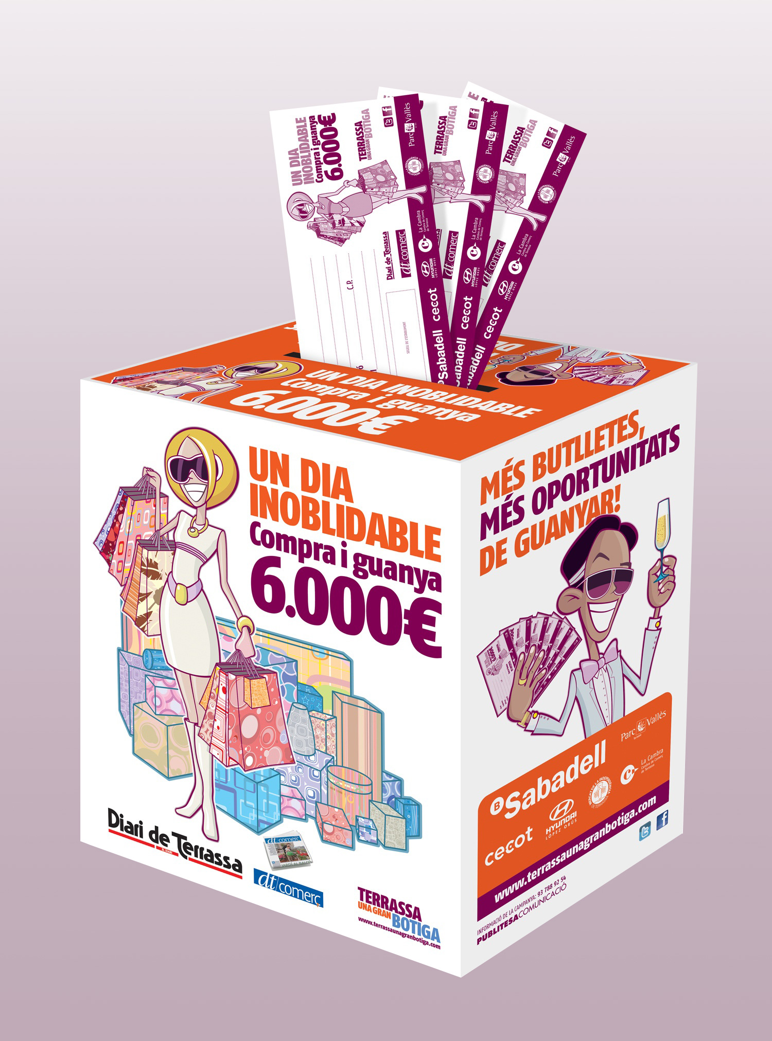 Proyecto de conceptualización y diseño gráfico para la campaña promocional Compra i guanya 6.000€, una iniciativa orientada a impulsar el comercio local y fomentar la implicación ciudadana en Terrassa. En esta iniciativa participan entidades como: Diari de Terrassa, Banc Sabadell, Cecot, La Cambra de Comerç, entre otras.